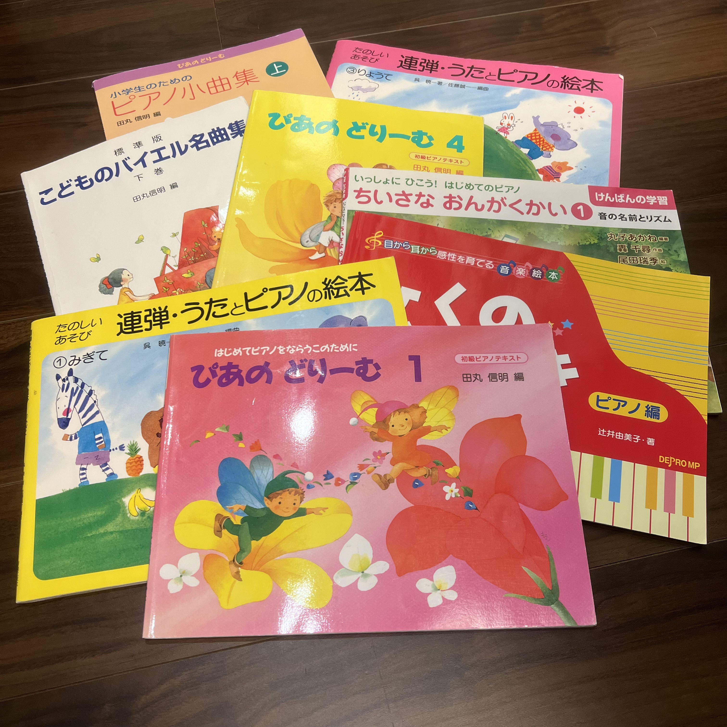 導入・初級教材は、主にうたとピアノの絵本・ぴあのどりーむ・バーナム等を使用していますが、生徒さんに合わせて、それ以外にも様々な教材を使用しています。