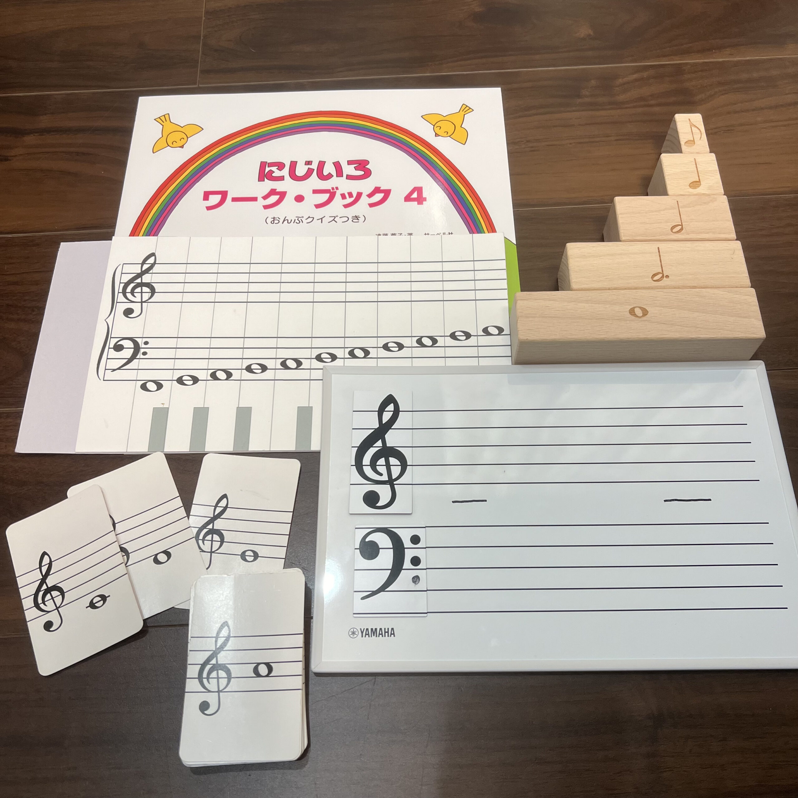 音符カードやワークブックなどを使用し、導入期にきちんと読譜力を身に付けます。